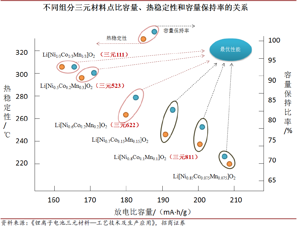 三元材料目前是動力電池最優之選。自鋰離子電池技術普及以來,學術界出現了各種各樣的電池體系,但是從實際應用來看,目前負極材料多選擇石墨,而正極材料主流為鈷酸鋰、磷酸鐵鋰、三元、錳酸鋰等材料。動力電池要求材料具有較高的能量密度(對應高續航里程)和高安全性,而鈷酸鋰由于其本身熱穩定性最差(安全性差),不適用于動力電池領域(但憑借高壓實密度和能量密度目前是3C 領域主流),而錳酸鋰能量密度較低應用受限,磷酸鐵鋰作為較早研發的技術,優點是安全性極好、環保、循環壽命高,但缺點在于能量密度較低且已經接近達到天花板,而三元本身有著高能量密度上限的優勢,未來隨著技術繼續進步,安全性問題逐步改善,在其他電池技術未實現重大突破之前,三元目前仍然是動力電池領域最優之選。