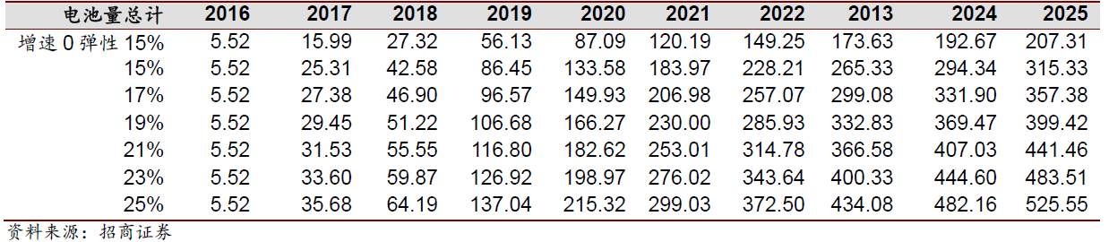 彈性需求曲線:彈性需求曲線統計了世界10大汽車廠商在2025年新能源汽車占當時乘用車總銷量比例的15-25%,分別取值15%、17%、19%、21%、23%、25%作為彈性值(作為比較還取了增速0彈性15%極端情況,即以2016年各個廠商總銷量作為2025 銷量),從而測算出2025年各個廠商新能源汽車銷量(2025總銷量根據各廠商實際增速情況估計),然后根據各個廠商實際銷量情況估算出2016-2025 新能源汽車銷量增速,得到每一年的銷量預計,最后以2016年各個廠商生產EV、PHEV 的比例和單車電池量(沒有的取平均值)為標準,并且假定2025年EV占比達到80%,從而推算出從2017-2025年在不同彈性條件下總電池需求量,進而根據1kWh 電池對應鋰、鈷的含量測算對應鋰、鈷的需求。