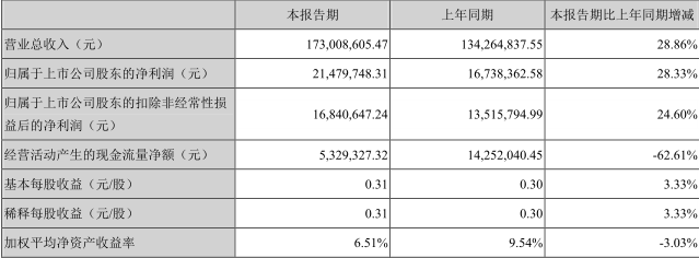今日電池雜志-中國電池聯盟訊(李冰 北京報道)8月25日,佛山市金銀河智能裝備股份有限公司(以下簡稱“公司”)發布公告。公告稱,報告期內,公司實現營業收入1.73億元,同比增長28.86%;凈利潤為2147.97萬元,同比增長28.33%;經營活動產生的現金流量凈額533萬元。基本每股收益0.31元/股。