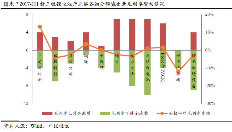 廣證恒生將鋰電池產業鏈細分為上游原材料、正極材料、負極材料、隔膜、電解液、輔材、動力電池和非動力電池、BMS和PACK、鋰電池檢測、鋰電池制造設備等細分領域,并將各細分領域內的新三板企業的營業收入、歸母凈利潤和毛利率變動情況進行梳理和分析。