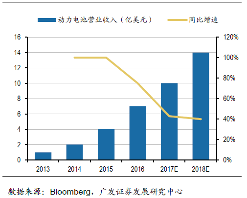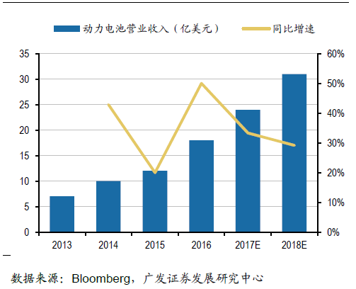 松下電器產(chǎn)業(yè)株式會社創(chuàng)建于1918年,于1994年開始研發(fā)可充電鋰離子電池。1998年松下開始量產(chǎn)筆記本電腦專用的圓柱形鋰離子電池,并建成了業(yè)內(nèi)領(lǐng)先的鋰離子電池生產(chǎn)線。2008年11月,松下宣布與三洋電機(jī)合并,一躍成為全球最大的鋰電池供應(yīng)商。隨著新能源汽車的興起,松下動力電池業(yè)務(wù)營業(yè)收入快速增長,2016年達(dá)18億美元,同比增速約為50%,2016年動力電池出貨量約為9.8GWh,同比增速56%。