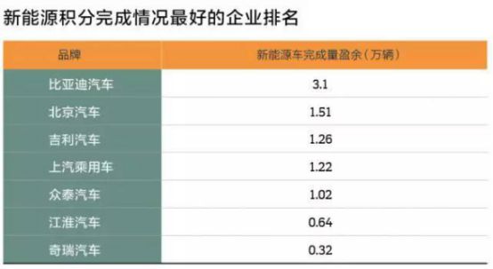 另一組數(shù)據(jù)顯示,目前僅有比亞迪汽車、北京汽車、吉利汽車、上汽乘用車、眾泰汽車、江淮汽車和奇瑞汽車共7家車企滿足積分要求,全部為自主品牌車企。