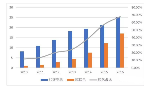 因軟包電池形狀設(shè)計靈活,體積和質(zhì)量能量密度高,符合手機、平板電腦等電子產(chǎn)品小型化、輕薄化的趨勢,在3C電池領(lǐng)域滲透率不斷提高,在3C電池領(lǐng)域滲透率不斷提高,從2010年的5%提升至2016年接近70%。但是,由于手機、平板電腦、筆記本電腦等傳統(tǒng)消費電子增速放緩,已經(jīng)入成熟期,預(yù)計增速維持10%左右。