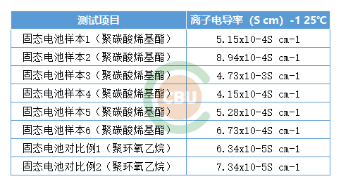 通過(guò)對(duì)比樣本與對(duì)比例數(shù)據(jù),可以看出,采用聚碳酸烯基酯制備得到的硫化物復(fù)合固態(tài)電解質(zhì)膜的離子電導(dǎo)率,均比采用聚環(huán)氧乙烷制備得到的硫化物復(fù)合固態(tài)電解質(zhì)膜離子電導(dǎo)率高,甚至提高了一個(gè)數(shù)量級(jí)。