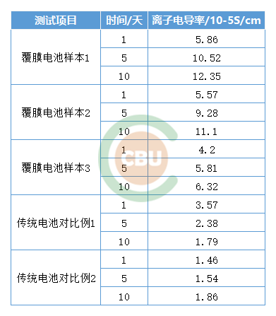 測(cè)試數(shù)據(jù):在60℃下,分別對(duì)覆有Li3PO4/LATP的金屬鋰片制成的固態(tài)電池與傳統(tǒng)鋰片電池在不同時(shí)間下的阻抗進(jìn)行測(cè)試,測(cè)試結(jié)果如下表,顯示出添加Li3PO4/LATP膜層后的固態(tài)電池鋰離子電導(dǎo)率有顯著提升,且隨時(shí)間的增加,離子電導(dǎo)率數(shù)據(jù)呈逐漸增加的趨勢(shì),而無(wú)膜層的呈現(xiàn)出衰減趨勢(shì)。由于離子電導(dǎo)率的增加更有利于鋰離子的脫嵌,此膜層的研發(fā)應(yīng)用提升了全固態(tài)鋰離子電池后期的電性能。