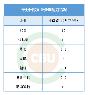 該負責人提到的“白名單”企業是指2018年首批符合《新能源汽車廢舊動力蓄電池綜合利用行業規范條件》的五家企業,分別是衢州華友鈷新材料有限公司(衢州華友)、贛州市豪鵬科技有限公司(贛州豪鵬)、荊門市格林美新材料有限公司(格林美)、湖南邦普循環科技有限公司(湖南邦普)和廣州光華科技股份有限公司(光華科技)。