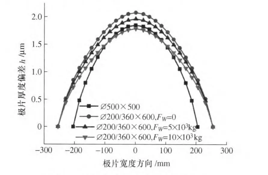 彎輥力Fw由0增加為10000kg時,最大極片厚度偏差減小0.3μm,極片沿寬度方向的厚度一致性有較小幅度改善。