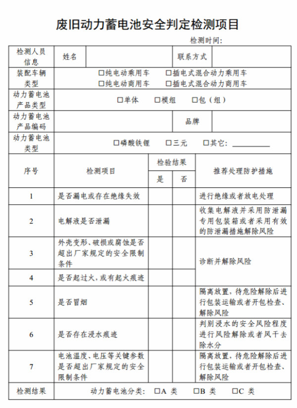 A類:結構功能完好、按附錄A檢測所有條款檢驗結果均為“否”,或經防護處理后重新檢測所有條款檢驗結果均為“否”的廢舊動力蓄電池。