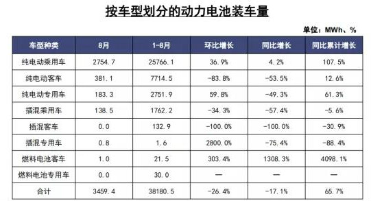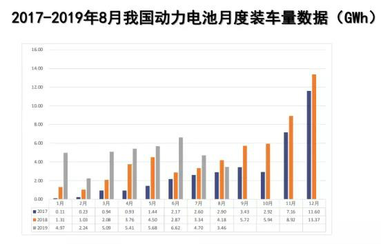2019年1-8月,我國動力電池裝車量累計38.2GWh,同比累計增長65.7%,其中三元電池裝車量累計26.1GWh,占總裝車量68.4%,同比累計增長90.0%;磷酸鐵鋰電池裝車量累計11.0GWh,占總裝車量28.8%,同比累計增長27.2%。