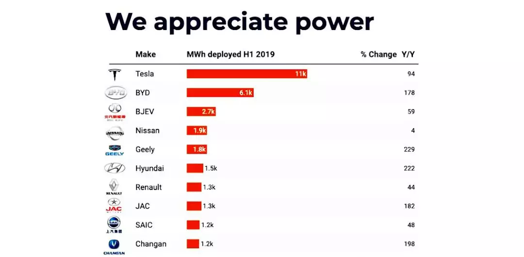 電動車市場調(diào)查報告顯示,2019年上半年產(chǎn)的新能源乘用車中裝載的電池總?cè)萘繛?6.3 GWh,特斯拉以11 GWh的裝機量排名第一。