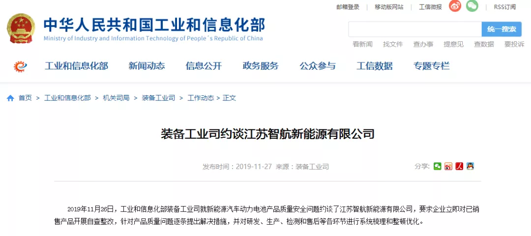 工信部今日消息,11月26日,工信部裝備工業司就新能源汽車動力電池產品質量安全問題約談了江蘇智航新能源有限公司,要求企業立即對已銷售產品開展自查整改,針對產品質量問題逐條提出解決措施,并對研發、生產、檢測和售后等各環節進行系統梳理和整頓優化。