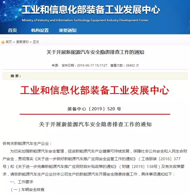 通知規定,各新能源汽車生產企業要于2019年10月底前完成排查工作,形成書面報告,如實向裝備中心報送安全隱患排查的組織情況、實施情況、運營主體配合情況、存在問題及問題處理情況等內容,填寫《新能源汽車安全排查統計表》。