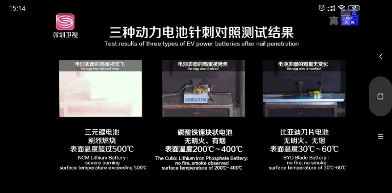 王傳福介紹,刀片電池具有高安全、長壽命、長續(xù)航的優(yōu)勢,是比亞迪基于磷鐵酸鋰技術(shù)的又一次創(chuàng)新。其體積能量密度與主流三元鋰電池持平,在相同體積下所儲(chǔ)存的電量也相差無幾,但安全性表現(xiàn)卻遠(yuǎn)遠(yuǎn)超出三元鋰電池。在針刺試驗(yàn)中,刀片電池針刺點(diǎn)附近位置僅有較低程度的溫升變化,基本杜絕了出現(xiàn)燃爆的可能。