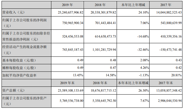 4月28日晚間,欣旺達發布2019年年度報告。2019年,公司實現營業收入252.41億元,同比增長24.1%;歸屬于上市公司股東的凈利潤7.51億元,同比增長7.06%。