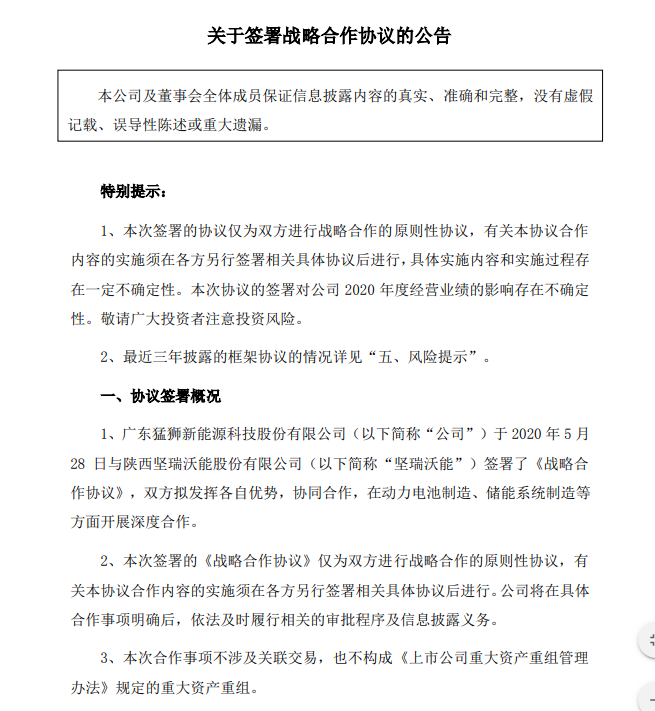 5月29日,廣東猛獅新能源科技股份有限公司(以下簡稱“猛獅科技”)發布公告稱,公司與陜西堅瑞沃能股份有限公司(以下簡稱“堅瑞沃能”)簽署了《戰略合作協議》,雙方擬發揮各自優勢,在動力電池制造、儲能系統制造等方面開展深度合作。