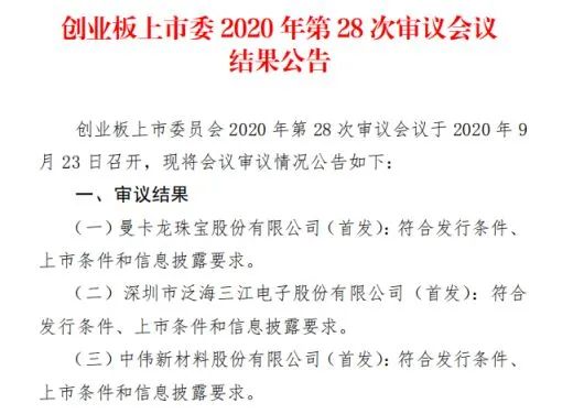 9月23日晚,創業板上市委發布2020年第28次審議會議結果公告,中偉新材料股份有限公司(以下簡稱:中偉股份)IPO成功過會。