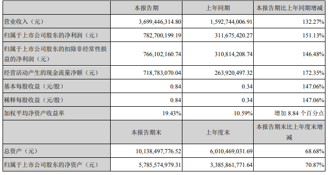 同一天,天賜材料還發布了2021年半年報,公司上半年實現營業總收入36.99億元,同比增長132.27%;歸屬母公司股東凈利潤7.83億元,同比增長151.13%。