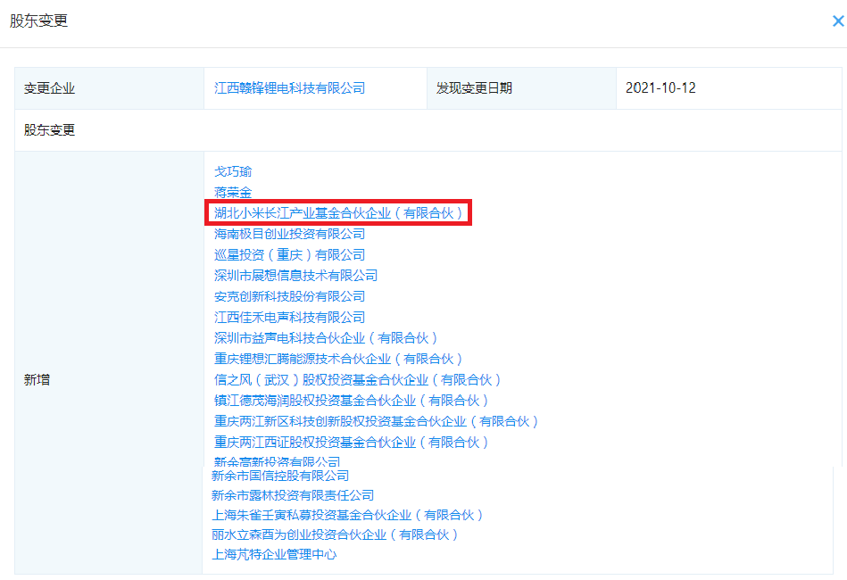 企查查顯示,贛鋒鋰電近日新增多位股東,其中包括湖北小米長江產業基金合伙企業(有限合伙)(以下簡稱“小米產投”)。