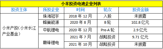 這已經不是小米第一次投資贛鋒鋰電。7月30日晚,贛鋒鋰業發布公告稱,擬以自有資金對控股子公司贛鋒鋰電增資20億元,小米產投、極目創投等作為領投方的投資方擬對贛鋒鋰電增資9.71億元。