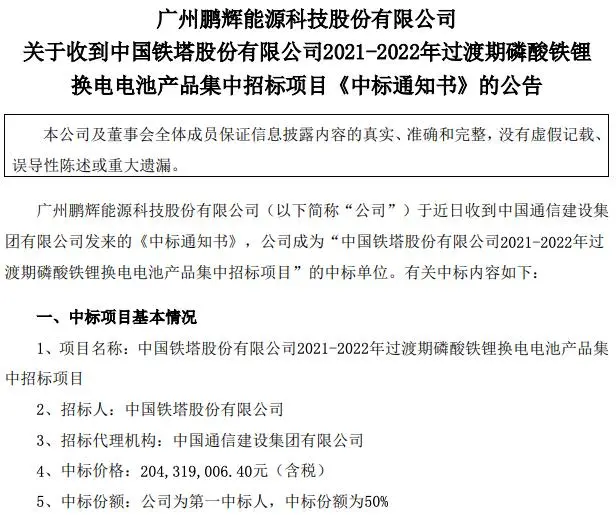 公告提到,鵬輝能源中標中國鐵塔股份有限公司2021-2022年過渡期磷酸鐵鋰換電電池產品集中招標項目,中標價格2.04億元,公司為第一中標人,中標份額為50%。