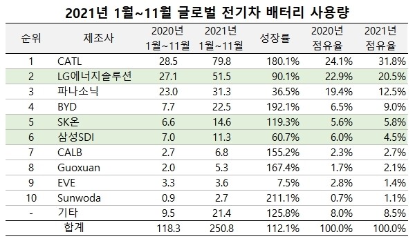 SNE Research指出,今年1-11月,中國企業引領了全球電動汽車市場(包含純電、插電混動和混合動力汽車)的增長。僅寧德時代和比亞迪兩家,市場占有率就超過40%,且與去年同期相比增長了180%、192%,在電動汽車市場有著極高的地位。據該機構分析,2021全年排名將和前11個月保持一致。