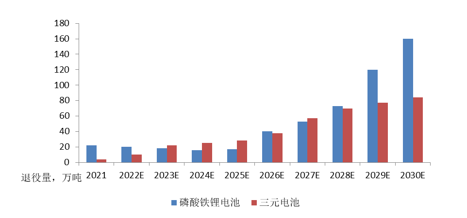 無論磷酸鐵鋰動力電池還是儲能電池,最終都會進入再生利用環節,再生利用市場前景廣闊。動力方面,預計2028年磷酸鐵鋰動力電池退役規模將全面反超三元電池,占據市場主流,2030年將達160萬噸,達到三元電池理論退役量的兩倍。儲能方面,考慮到磷酸鐵鋰儲能電池(包括梯次電池)一般不再進行梯次利用而直接進入報廢回收環節,未來磷酸鐵鋰廢舊電池和磷酸鐵鋰廢料產量有望持續高速增長。