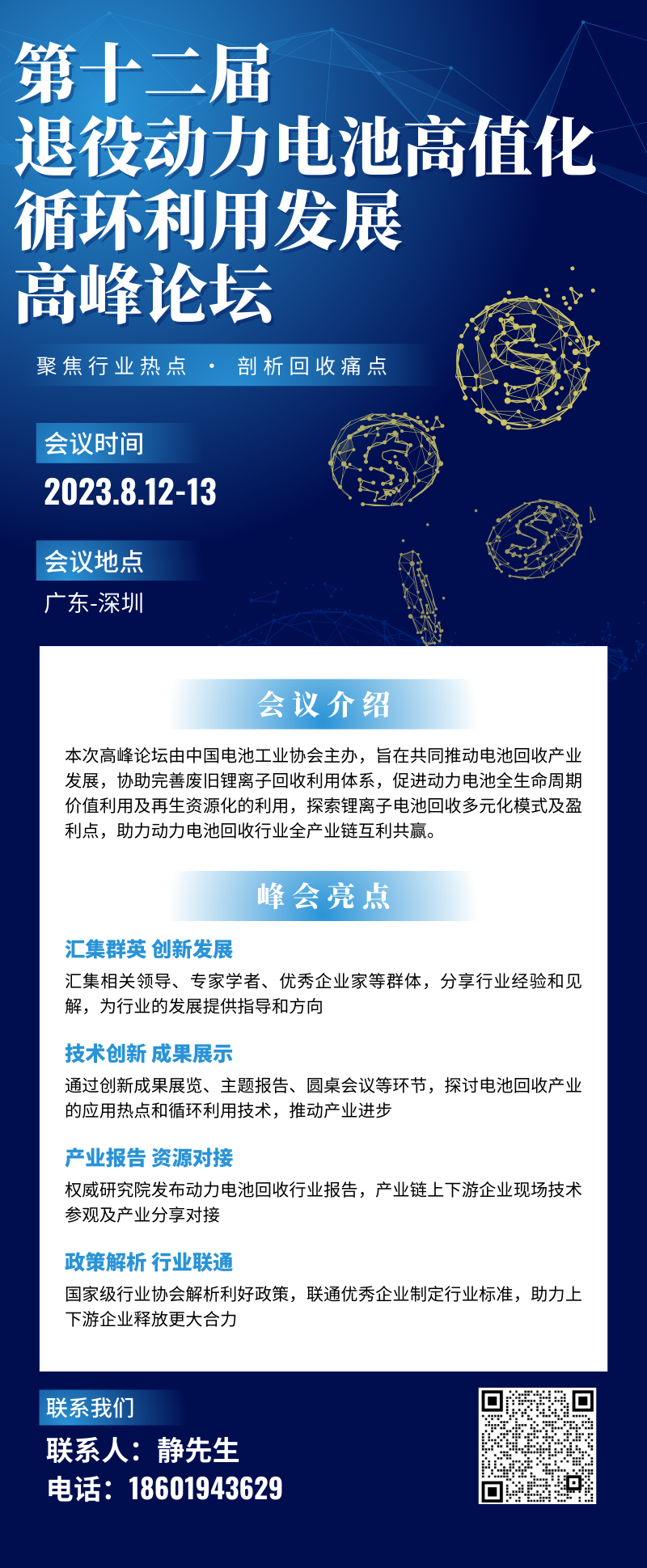 由中國電池工業協會主辦、電池聯盟承辦的“第十二屆退役動力電池高值化循環利用發展高峰論壇”將于2023年8月12-13日在廣東深圳召開。