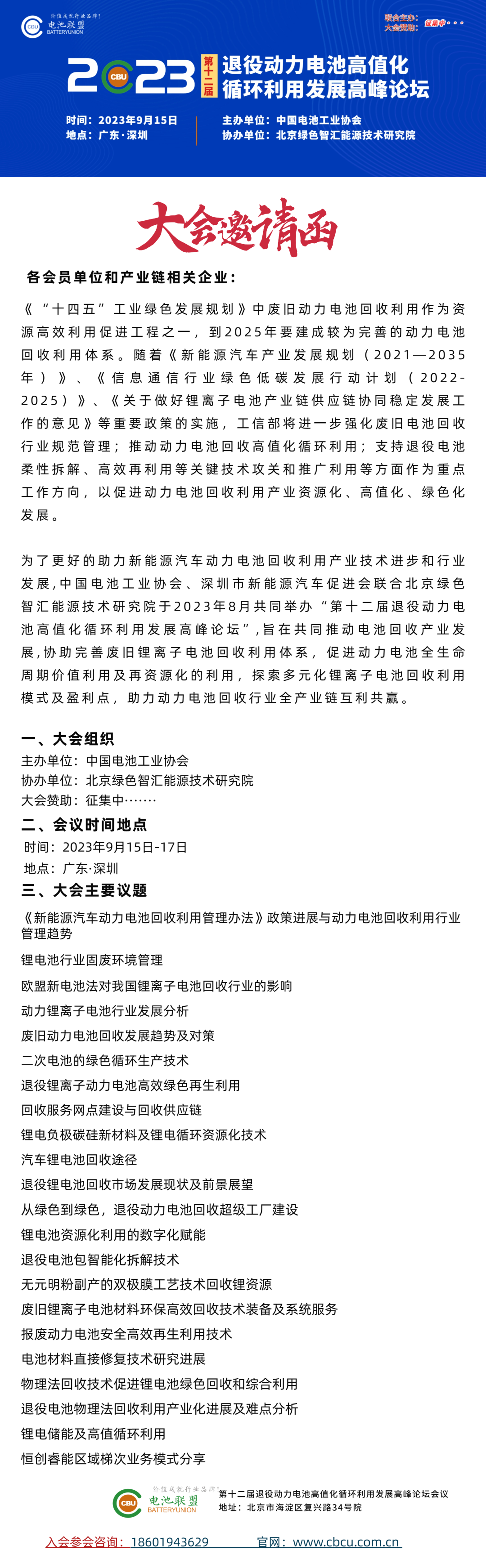 在此背景下,由中國電池工業協會主辦、電池聯盟承辦的“第十二屆退役動力電池高值化循環利用發展高峰論壇”,將于2023年9月16-17日在廣東深圳召開。