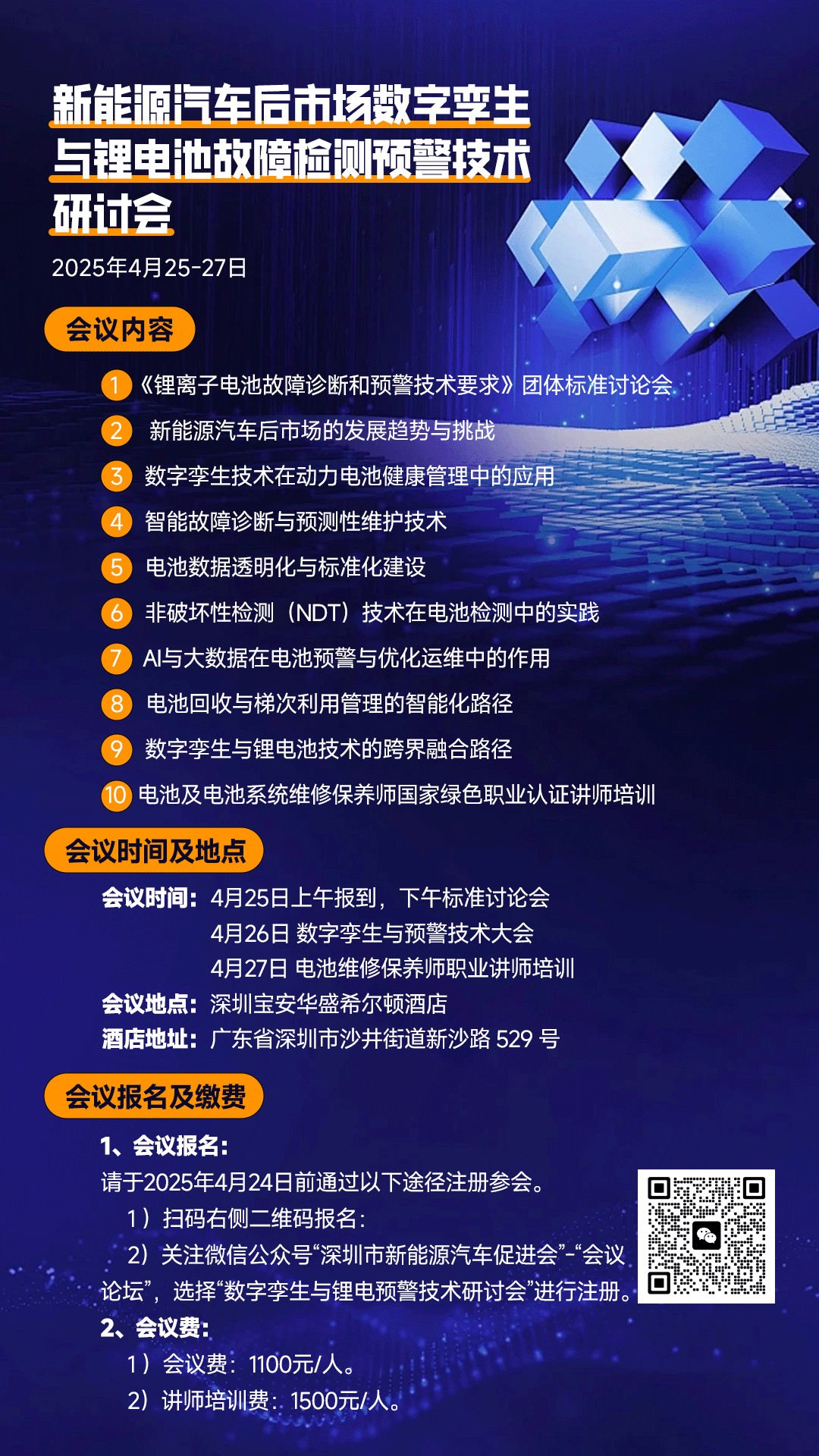 “新能源汽車后市場(chǎng)數(shù)字孿生與鋰電池故障檢測(cè)預(yù)警技術(shù)研討會(huì)”將于2025年4月25-27日在深圳寶安區(qū)安華盛希爾頓酒店舉辦,預(yù)計(jì)會(huì)規(guī)模400+,大會(huì)以數(shù)智驅(qū)動(dòng)·安全賦能——新能源汽車后市場(chǎng)的技術(shù)創(chuàng)新與生態(tài)共建為主題。