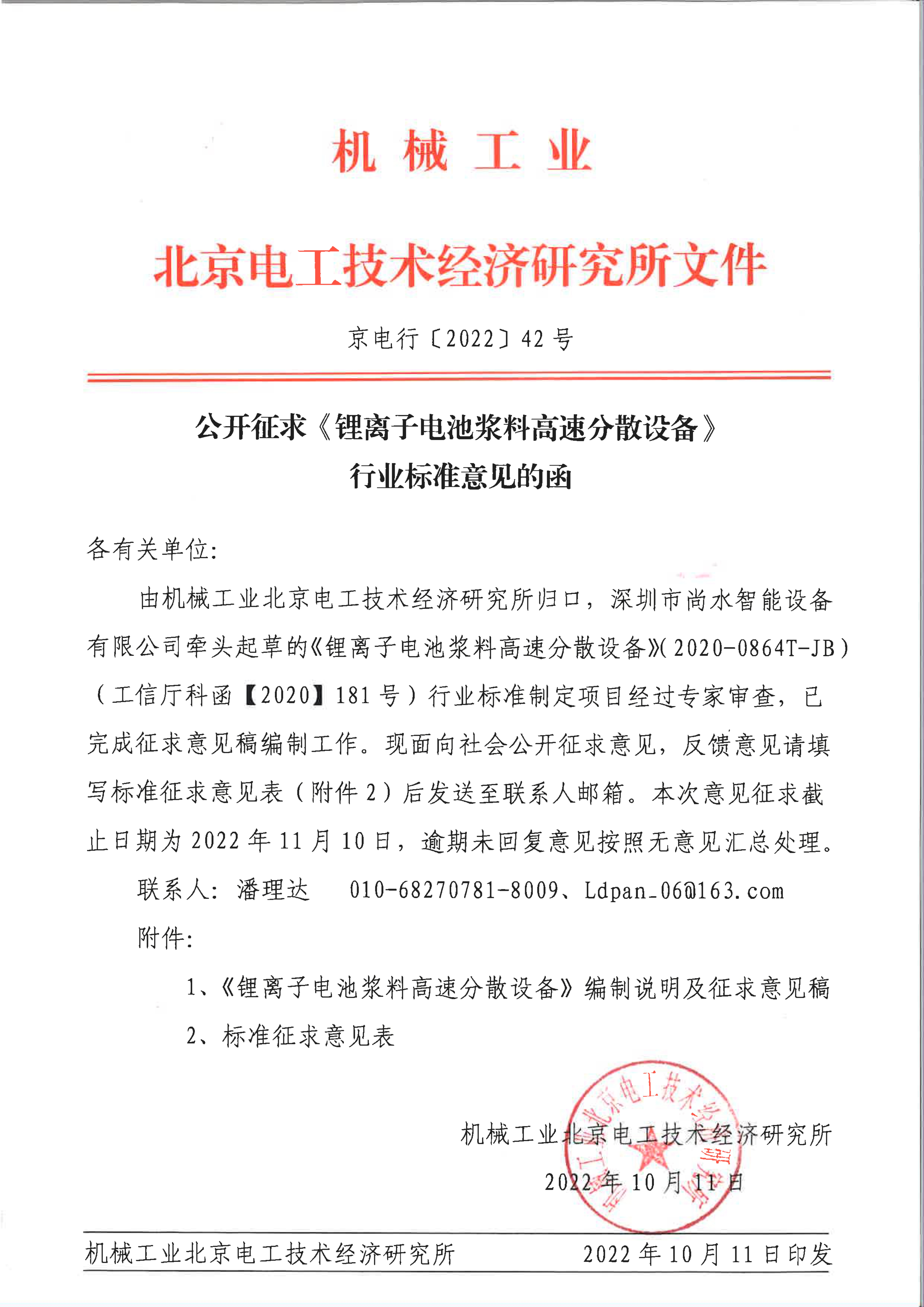 公開征求《鋰離子電池漿料高速分散設備》行業標準意見的函