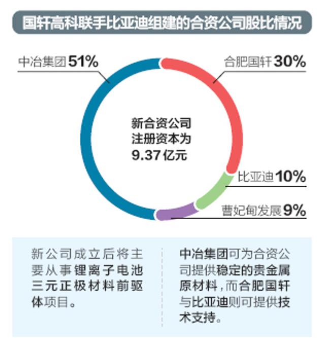 8月30日,國軒高科(002074,SZ)發布公告稱,公司全資子公司合肥國軒高科動力能源有限公司(以下簡稱合肥國軒)擬與中國冶金科工集團有限公司(以下簡稱中冶集團)、比亞迪(002594,SZ)、唐山曹妃甸發展投資集團有限公司(以下簡稱曹妃甸發展)共同成立新合資公司,主要從事鋰離子電池三元正極材料前驅體(以下簡稱三元前驅體)項目。