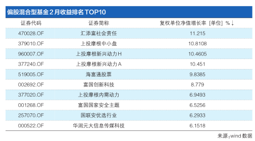 偏股混合型基金2月收益表現亮眼,匯添富社會責任基金以11.21%的收益率排名第一,超過當月普通股票型基金的最高收益率。緊隨其后的是上投摩根的三只產品:上投摩根中小盤、上投摩根新興動力H和上投摩根新興動力A,其收益率分別為10.81%、10.46%和10.45%。